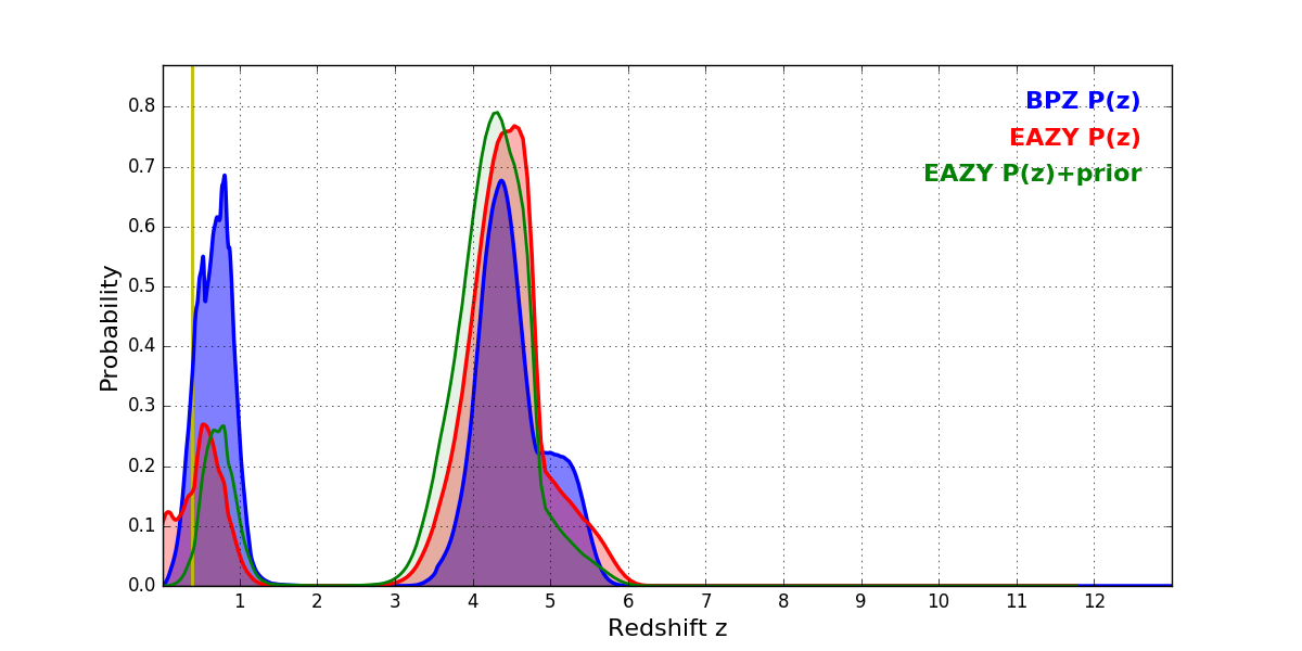 In P(z) plots: Yellow lines mark the cluster redshift z = 0.390,