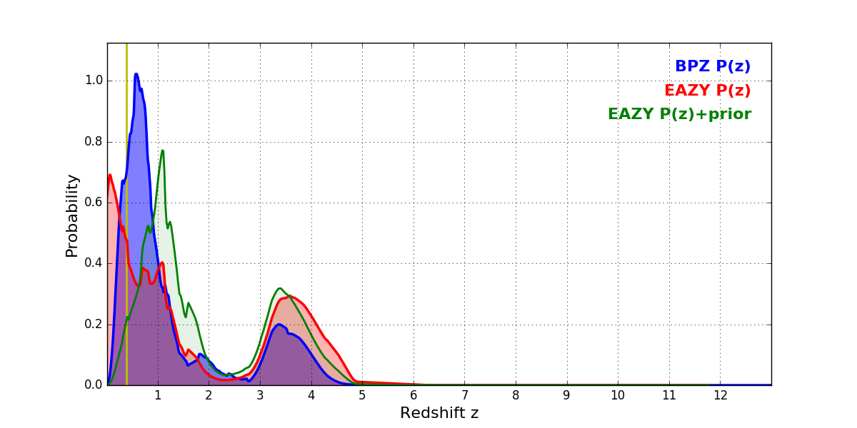 In P(z) plots: Yellow lines mark the cluster redshift z = 0.390,