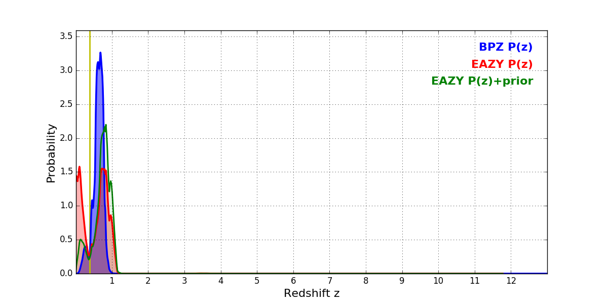 In P(z) plots: Yellow lines mark the cluster redshift z = 0.390,