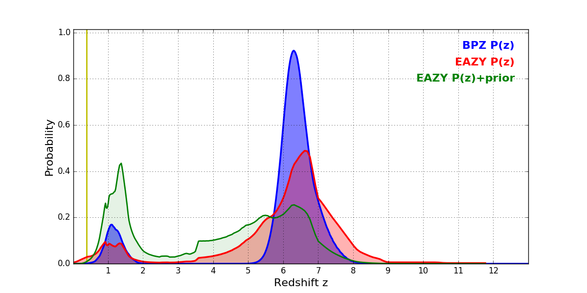 In P(z) plots: Yellow lines mark the cluster redshift z = 0.390,