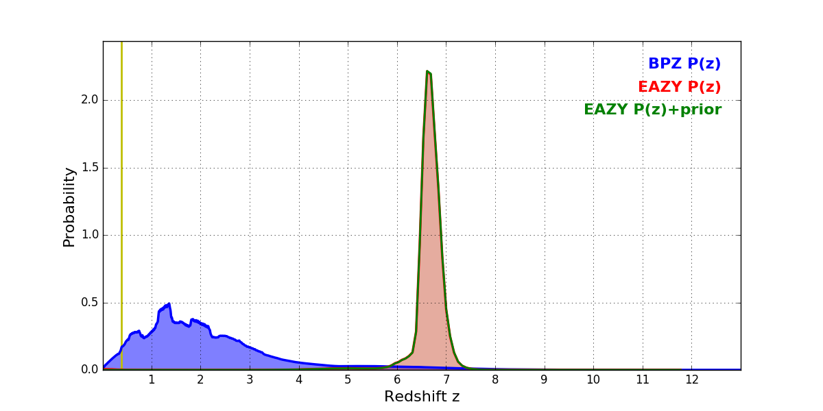 In P(z) plots: Yellow lines mark the cluster redshift z = 0.390,