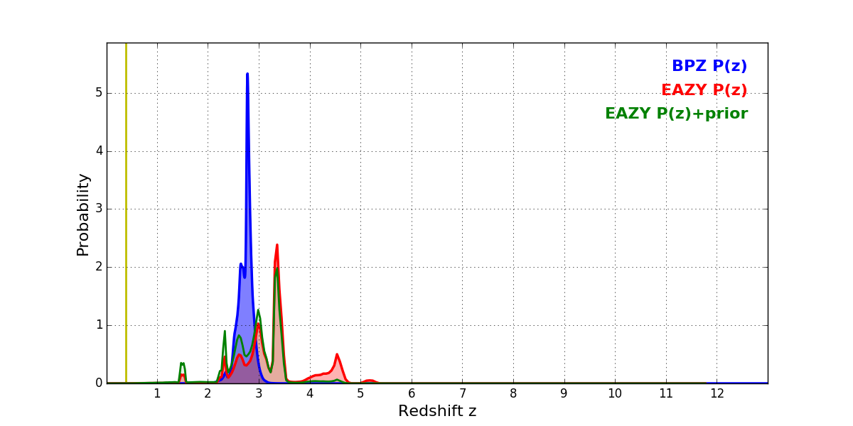 In P(z) plots: Yellow lines mark the cluster redshift z = 0.390,