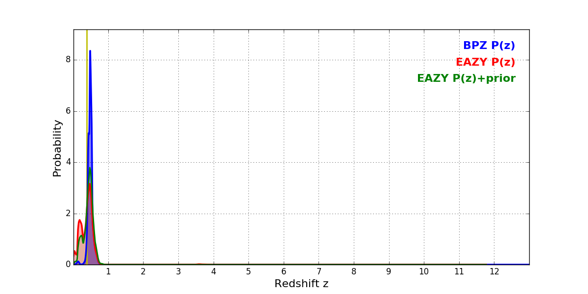 In P(z) plots: Yellow lines mark the cluster redshift z = 0.390,