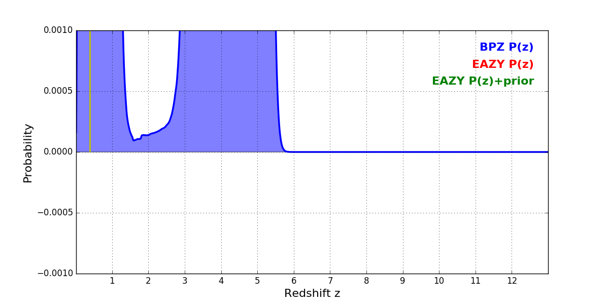 In P(z) plots: Yellow lines mark the cluster redshift z = 0.390,