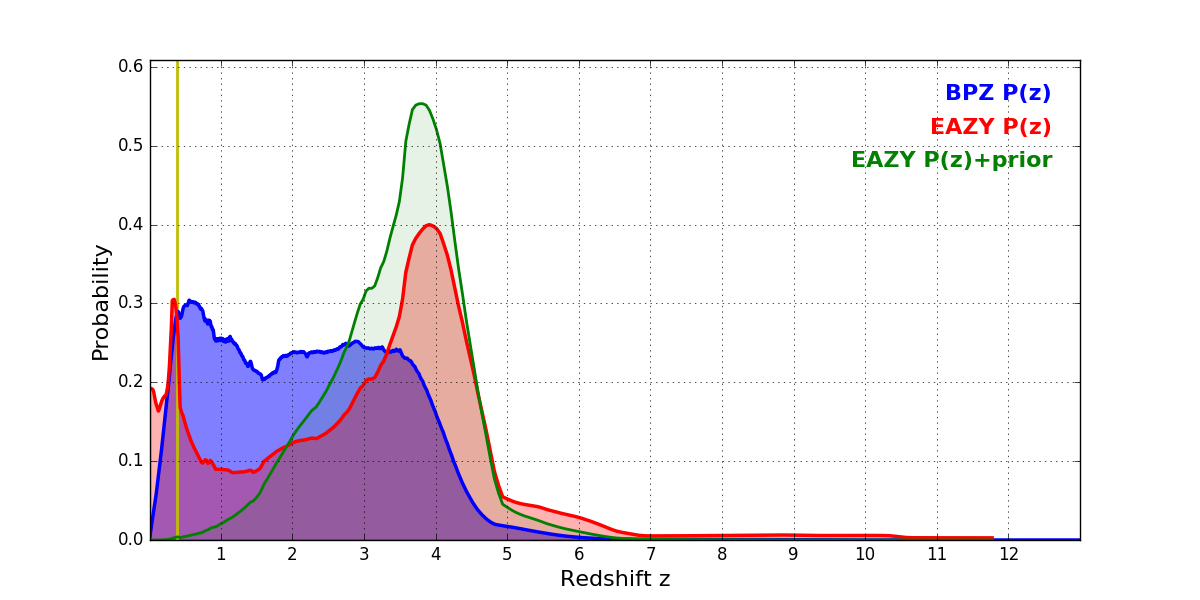 In P(z) plots: Yellow lines mark the cluster redshift z = 0.390,