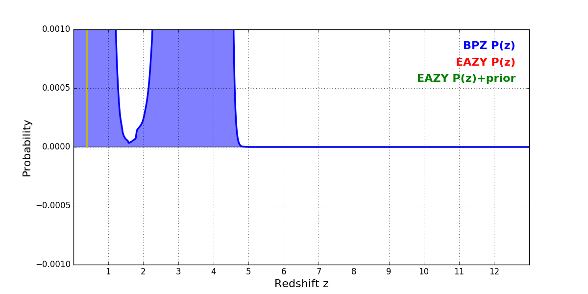 In P(z) plots: Yellow lines mark the cluster redshift z = 0.390,