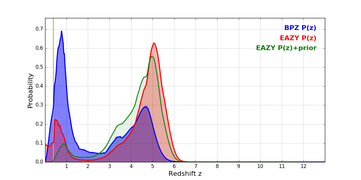 In P(z) plots: Yellow lines mark the cluster redshift z = 0.390,
