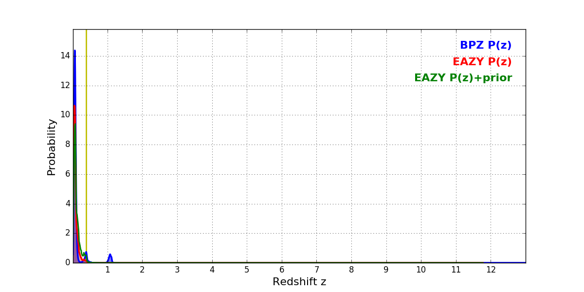 In P(z) plots: Yellow lines mark the cluster redshift z = 0.390,