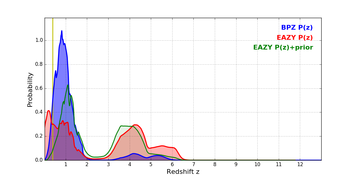 In P(z) plots: Yellow lines mark the cluster redshift z = 0.390,