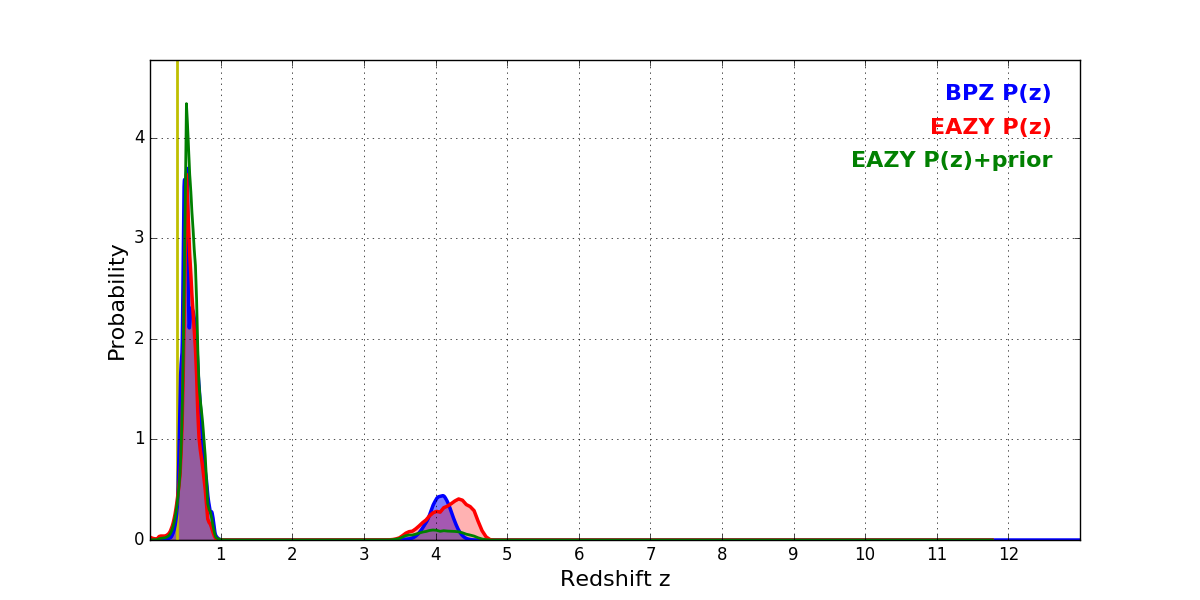 In P(z) plots: Yellow lines mark the cluster redshift z = 0.390,