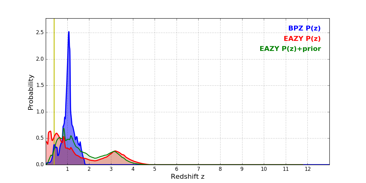 In P(z) plots: Yellow lines mark the cluster redshift z = 0.390,