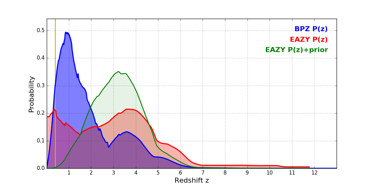 In P(z) plots: Yellow lines mark the cluster redshift z = 0.390,