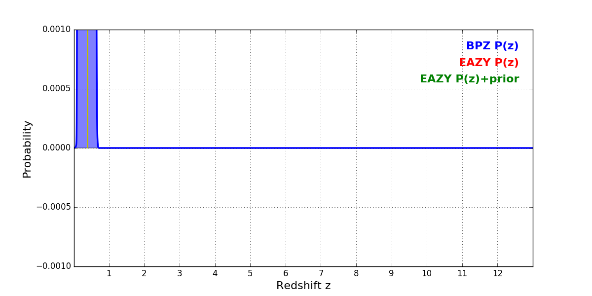 In P(z) plots: Yellow lines mark the cluster redshift z = 0.390,