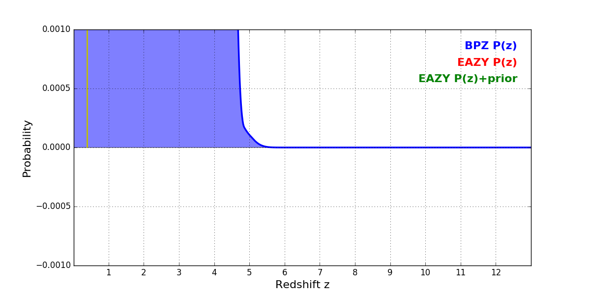 In P(z) plots: Yellow lines mark the cluster redshift z = 0.390,