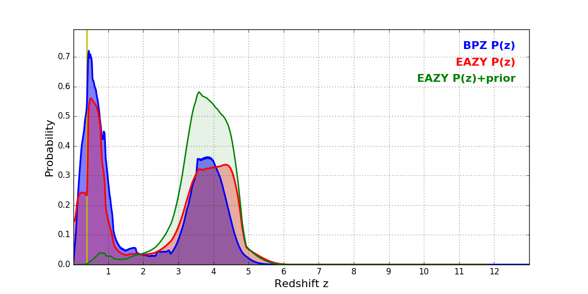 In P(z) plots: Yellow lines mark the cluster redshift z = 0.390,