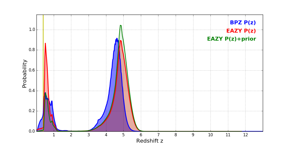 In P(z) plots: Yellow lines mark the cluster redshift z = 0.390,