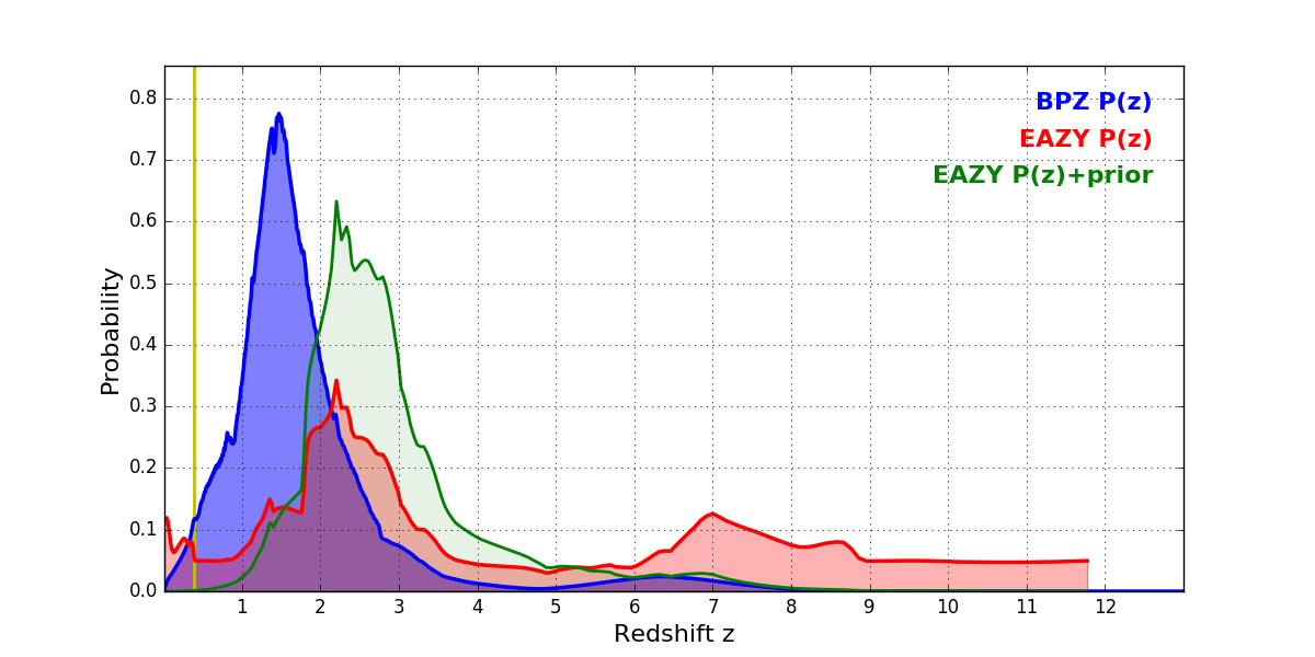 In P(z) plots: Yellow lines mark the cluster redshift z = 0.390,