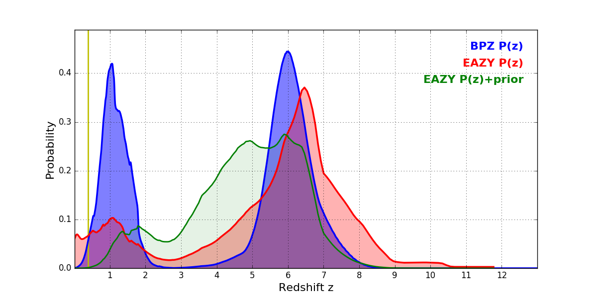 In P(z) plots: Yellow lines mark the cluster redshift z = 0.390,
