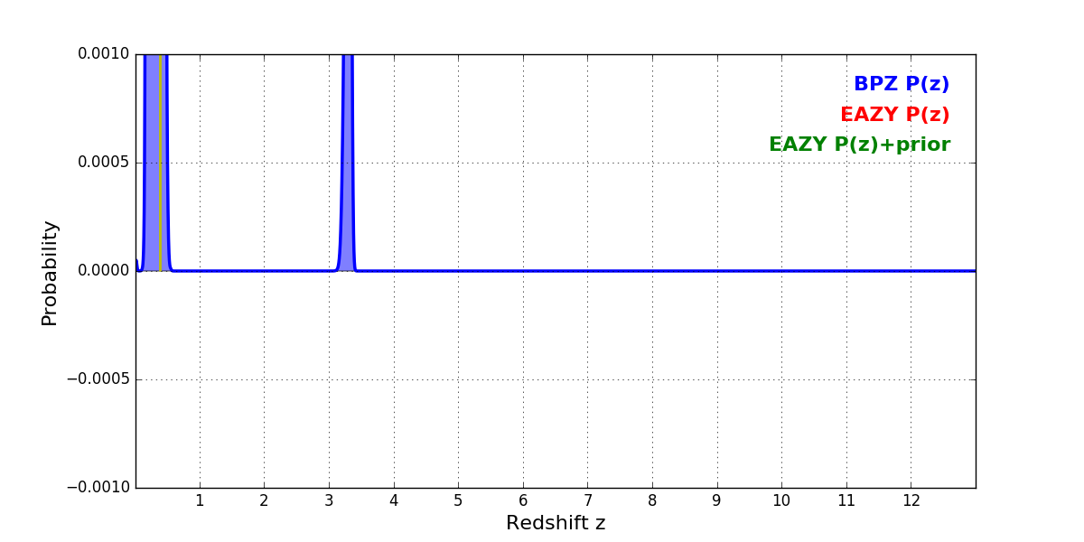 In P(z) plots: Yellow lines mark the cluster redshift z = 0.390,