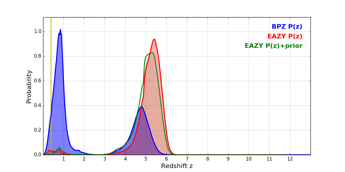 In P(z) plots: Yellow lines mark the cluster redshift z = 0.390,