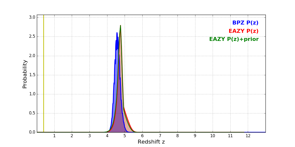 In P(z) plots: Yellow lines mark the cluster redshift z = 0.390,