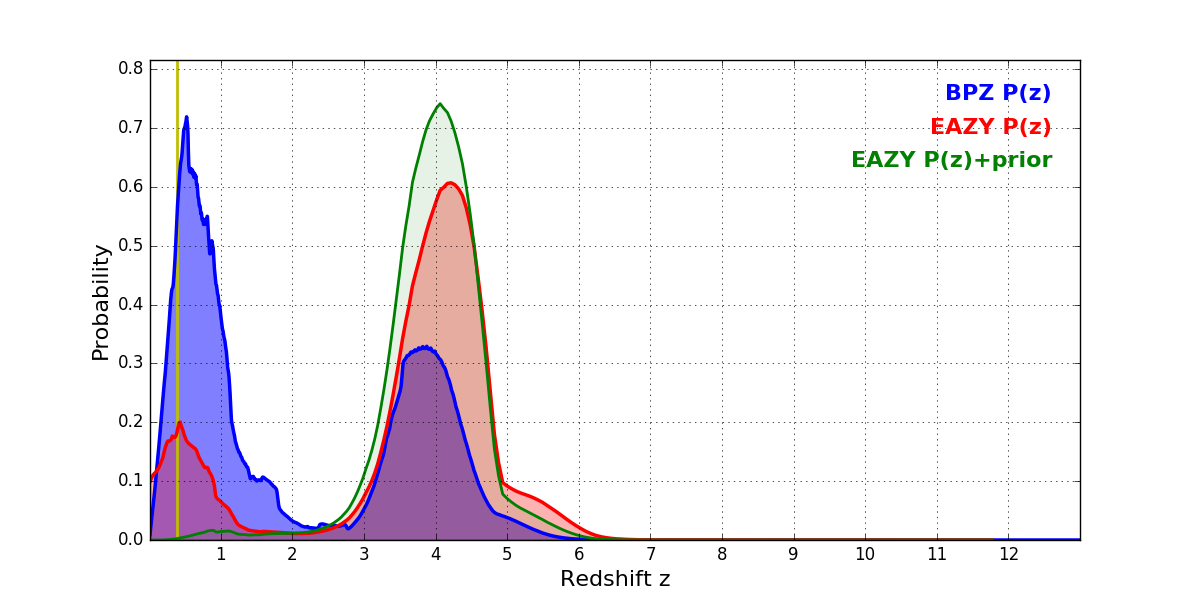 In P(z) plots: Yellow lines mark the cluster redshift z = 0.390,