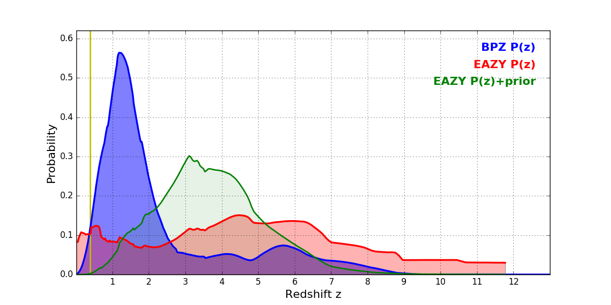 In P(z) plots: Yellow lines mark the cluster redshift z = 0.390,
