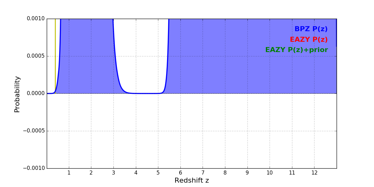 In P(z) plots: Yellow lines mark the cluster redshift z = 0.390,