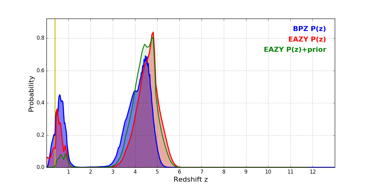 In P(z) plots: Yellow lines mark the cluster redshift z = 0.390,