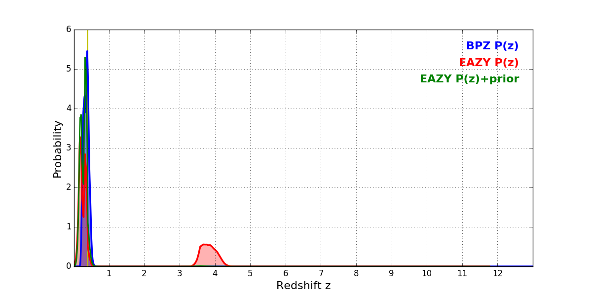 In P(z) plots: Yellow lines mark the cluster redshift z = 0.390,