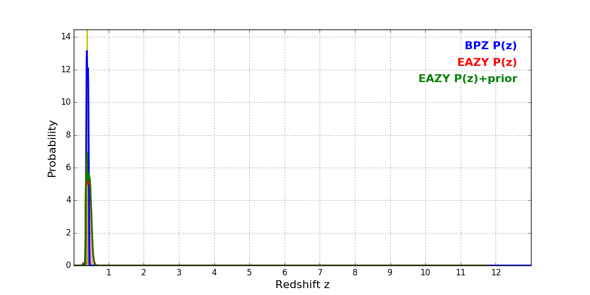 In P(z) plots: Yellow lines mark the cluster redshift z = 0.390,
