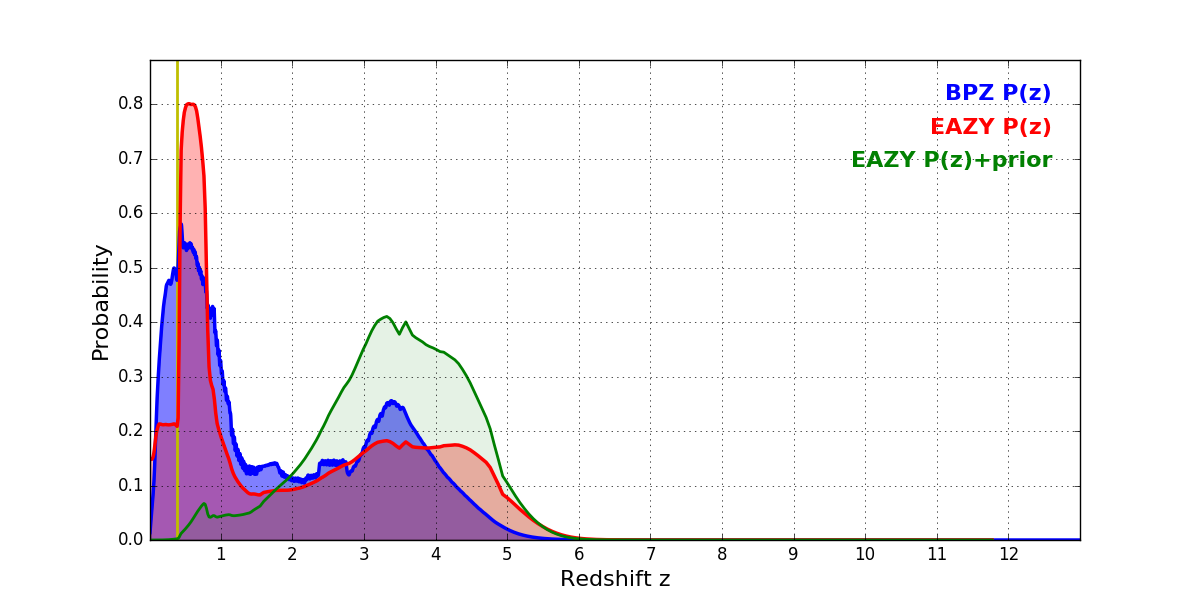 In P(z) plots: Yellow lines mark the cluster redshift z = 0.390,