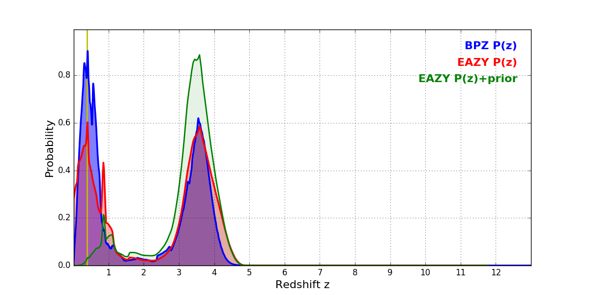 In P(z) plots: Yellow lines mark the cluster redshift z = 0.390,