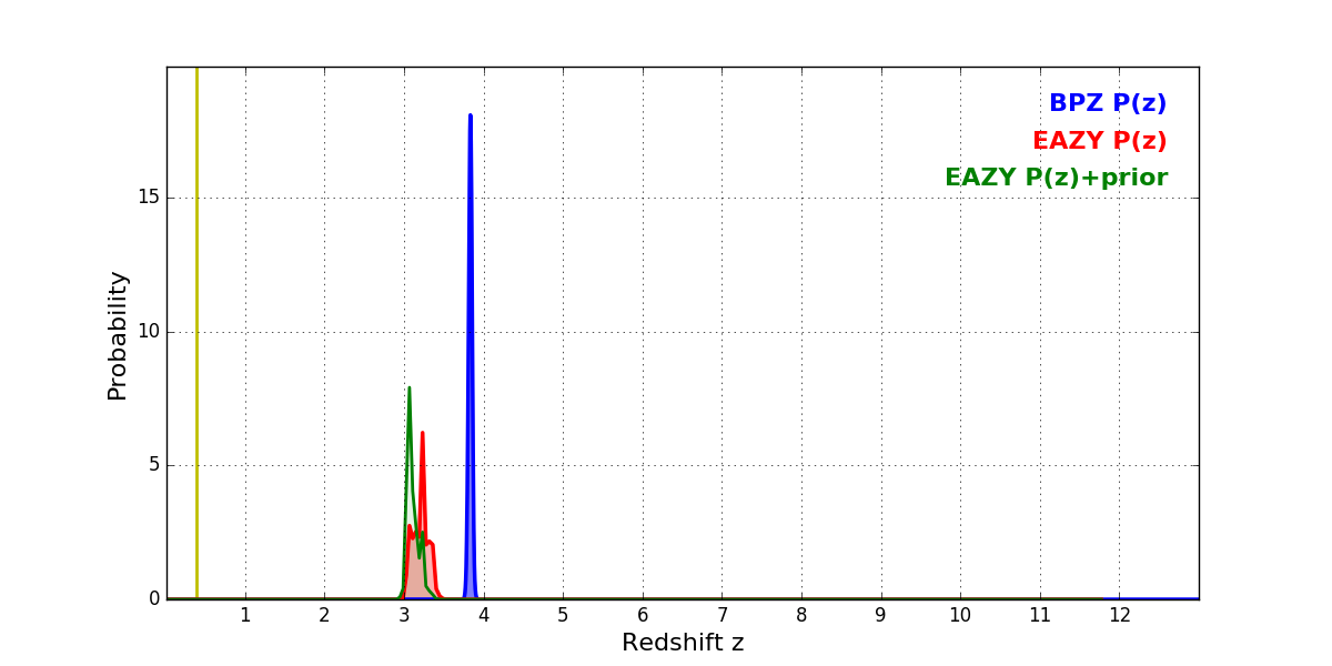 In P(z) plots: Yellow lines mark the cluster redshift z = 0.390,