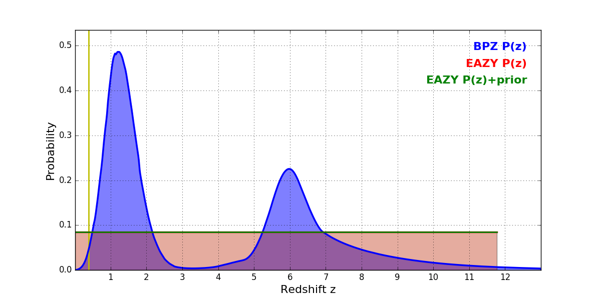 In P(z) plots: Yellow lines mark the cluster redshift z = 0.390,