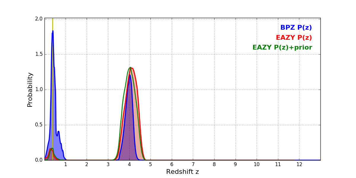 In P(z) plots: Yellow lines mark the cluster redshift z = 0.390,