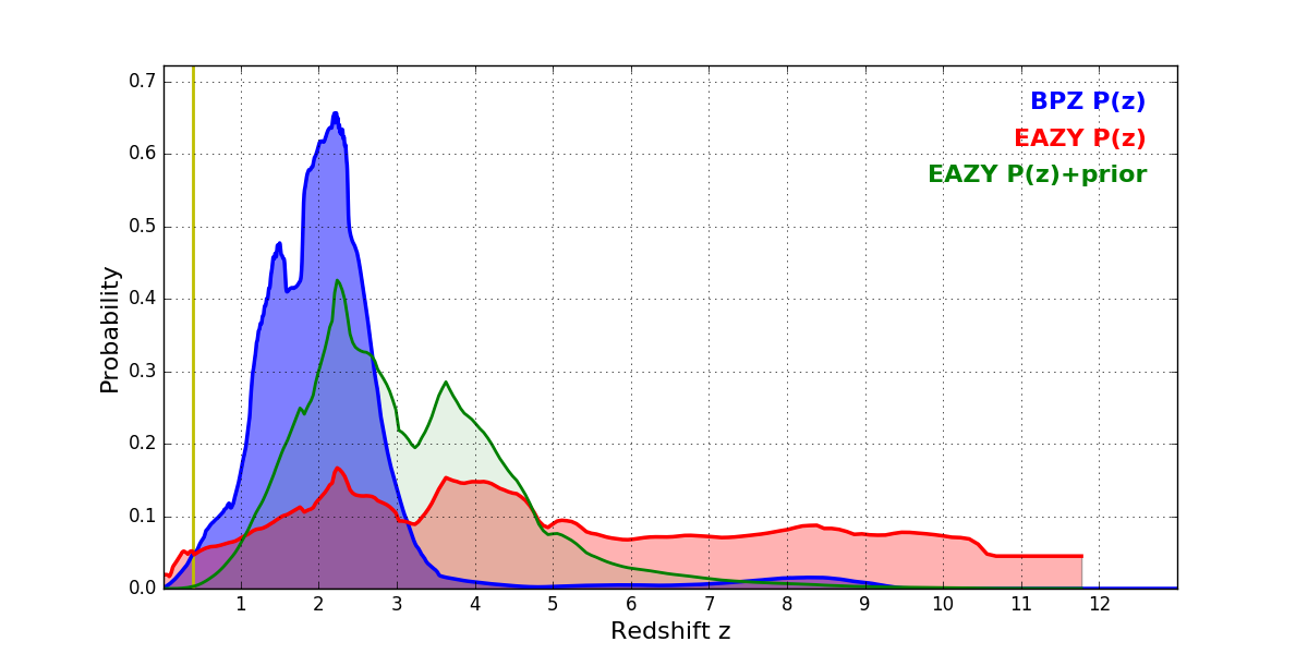 In P(z) plots: Yellow lines mark the cluster redshift z = 0.390,