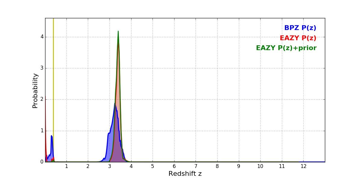 In P(z) plots: Yellow lines mark the cluster redshift z = 0.390,