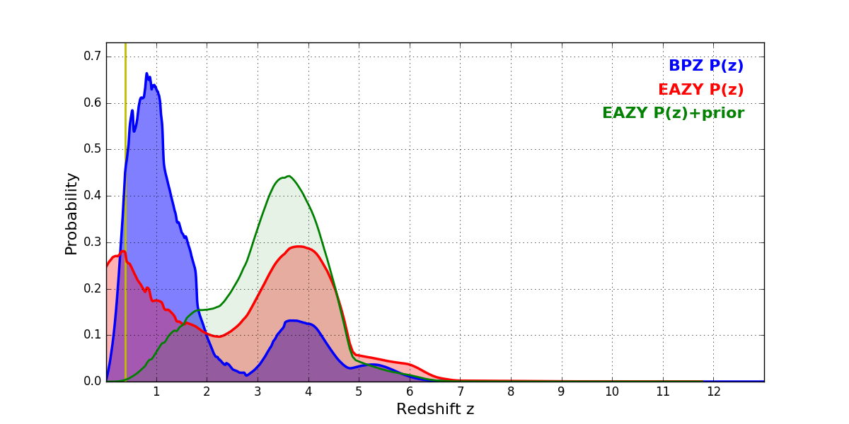 In P(z) plots: Yellow lines mark the cluster redshift z = 0.390,