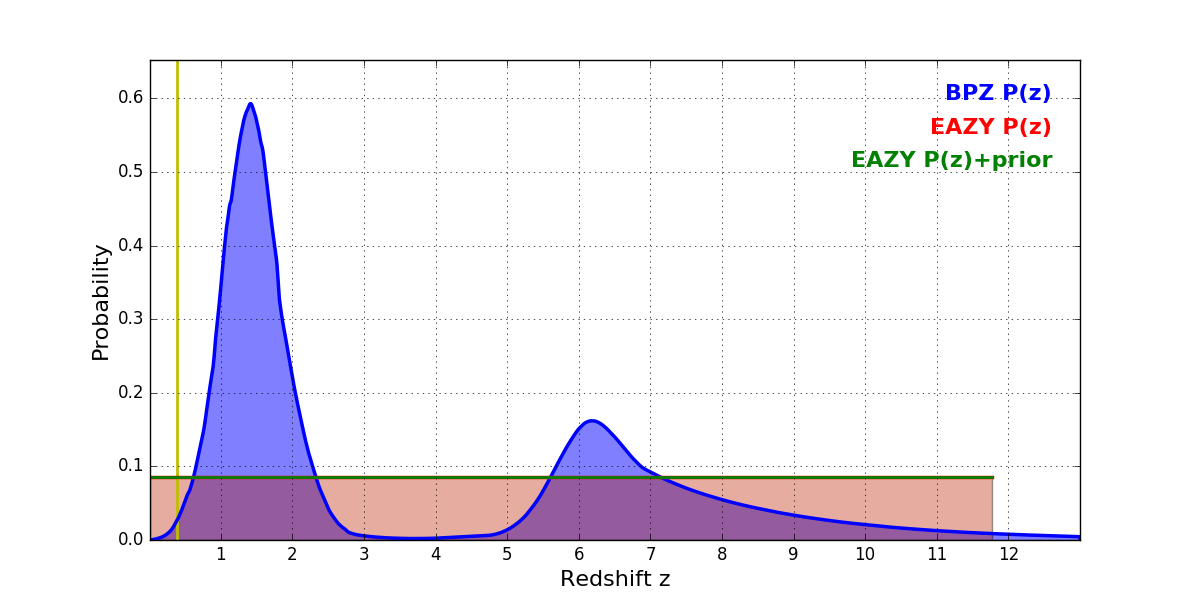 In P(z) plots: Yellow lines mark the cluster redshift z = 0.390,