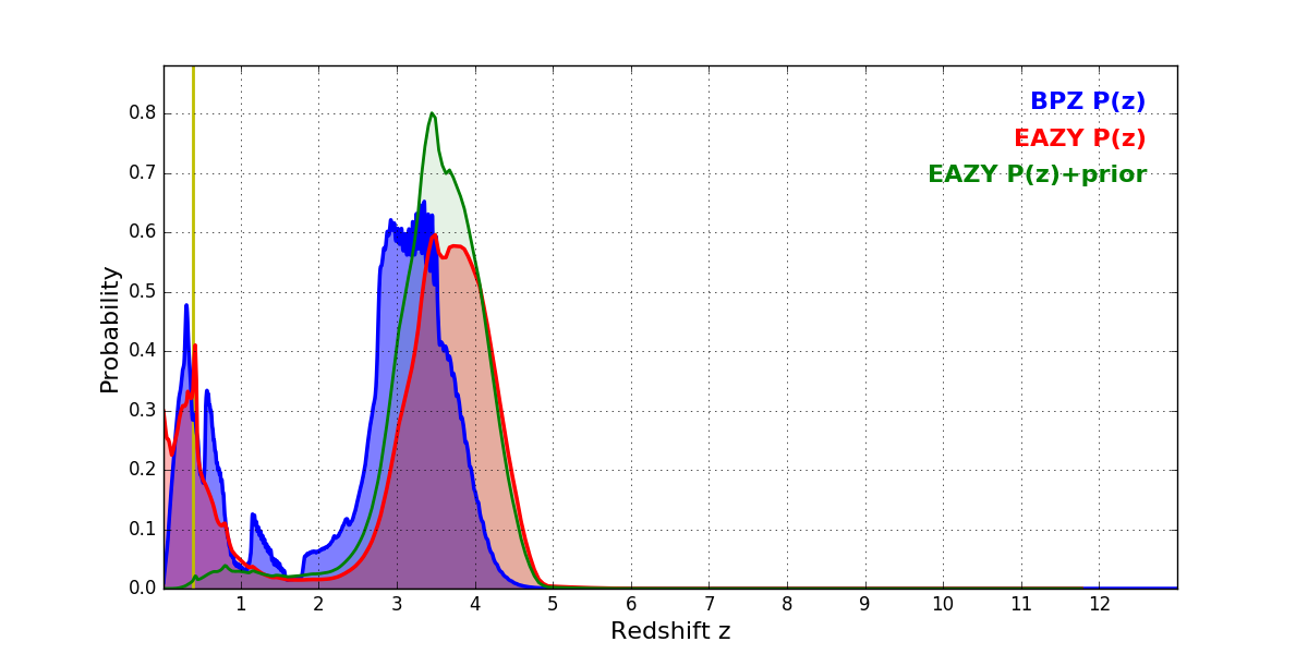 In P(z) plots: Yellow lines mark the cluster redshift z = 0.390,