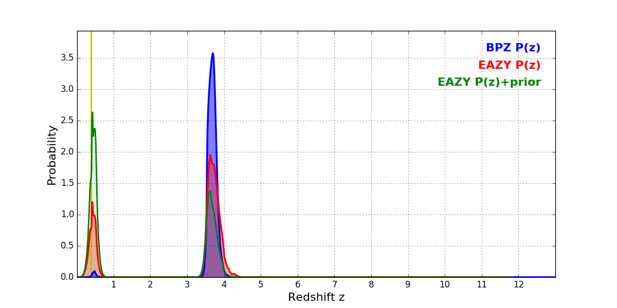 In P(z) plots: Yellow lines mark the cluster redshift z = 0.390,