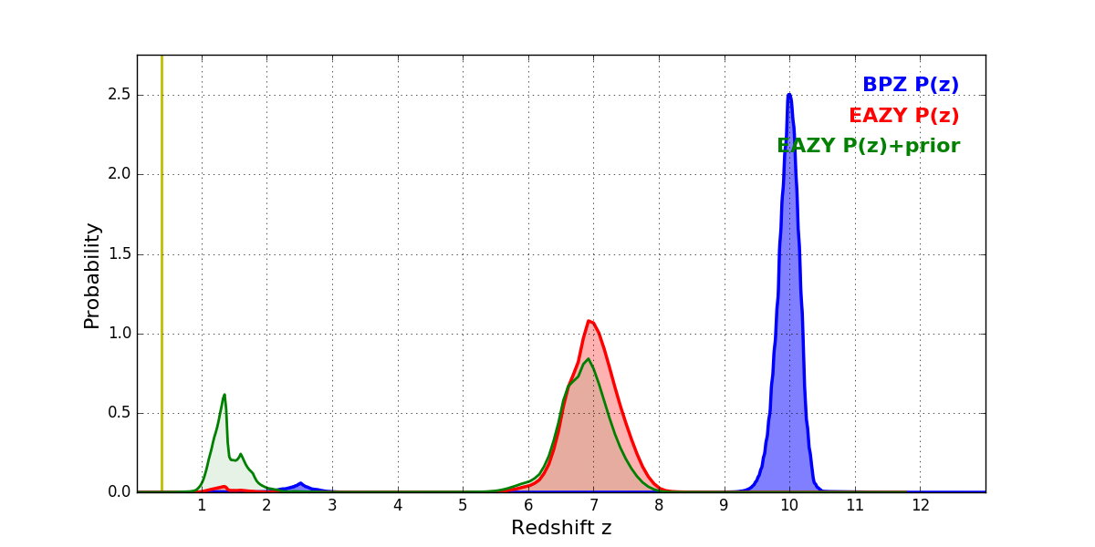 In P(z) plots: Yellow lines mark the cluster redshift z = 0.390,