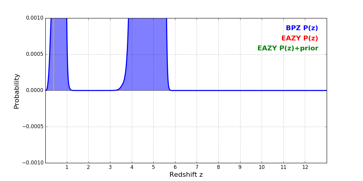 In P(z) plots: Yellow lines mark the cluster redshift z = 0.390,