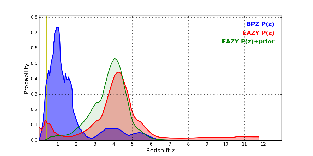 In P(z) plots: Yellow lines mark the cluster redshift z = 0.390,