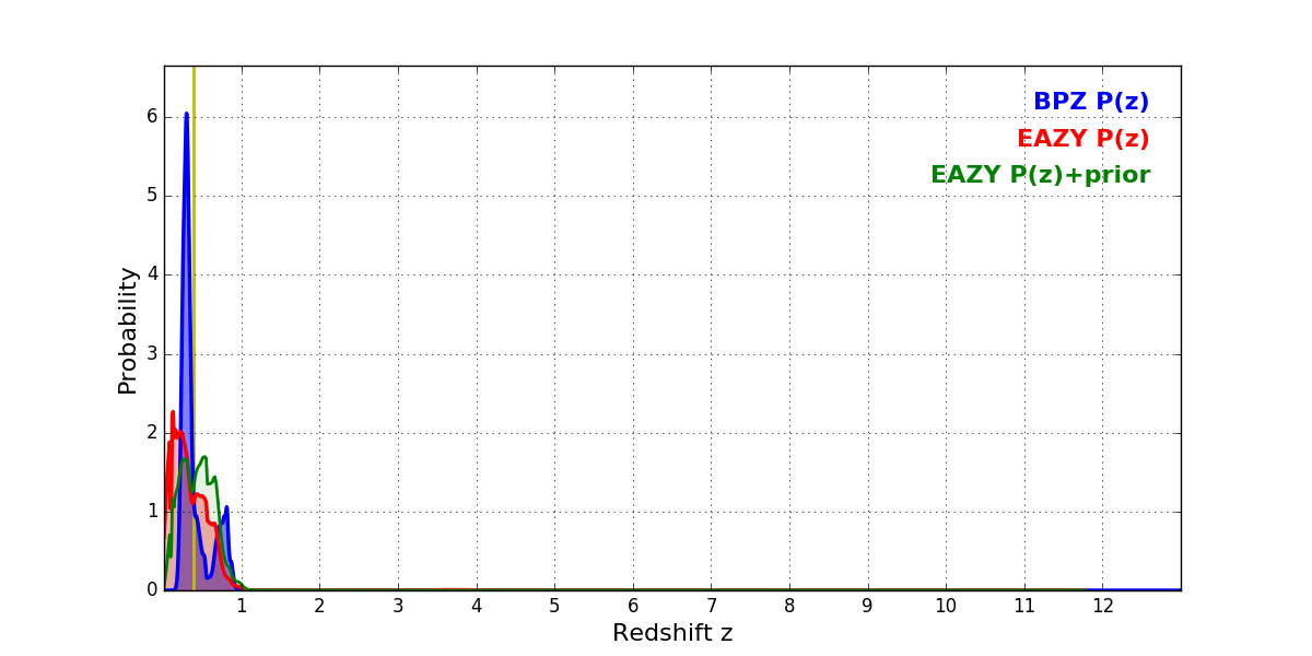 In P(z) plots: Yellow lines mark the cluster redshift z = 0.390,