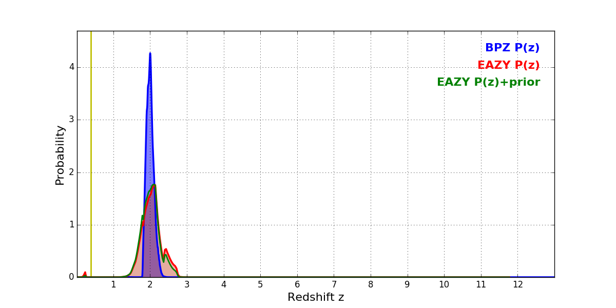 In P(z) plots: Yellow lines mark the cluster redshift z = 0.390,