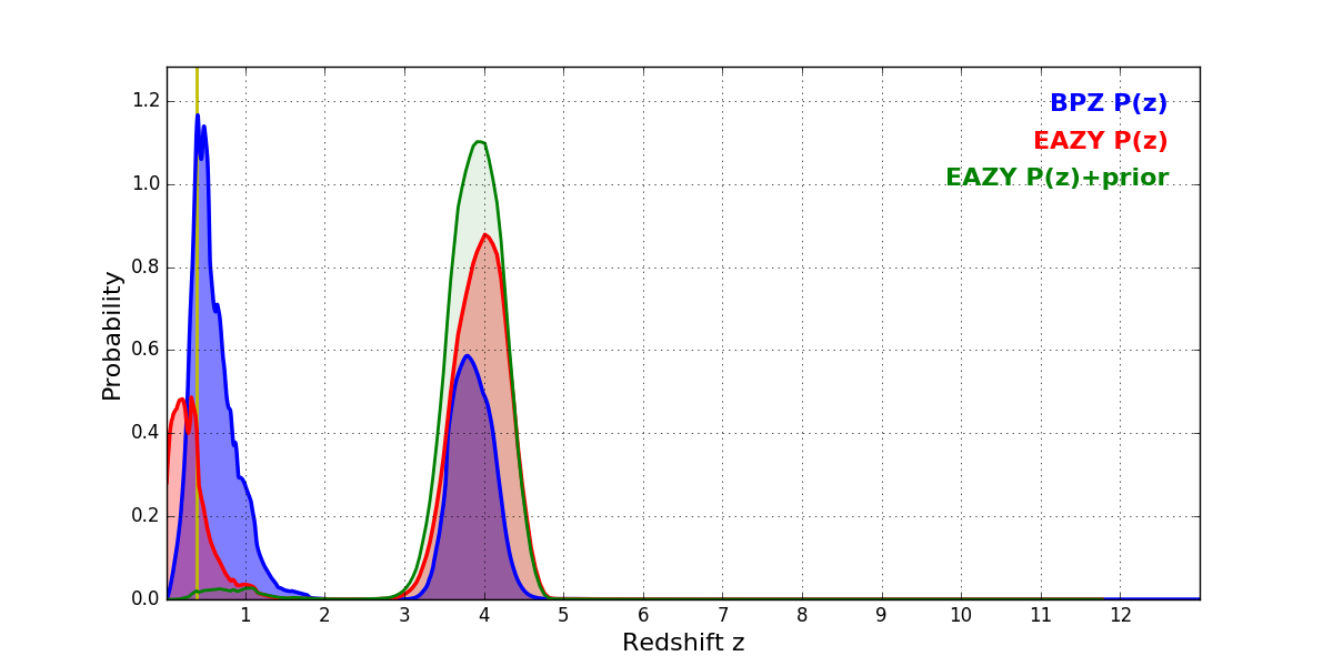 In P(z) plots: Yellow lines mark the cluster redshift z = 0.390,