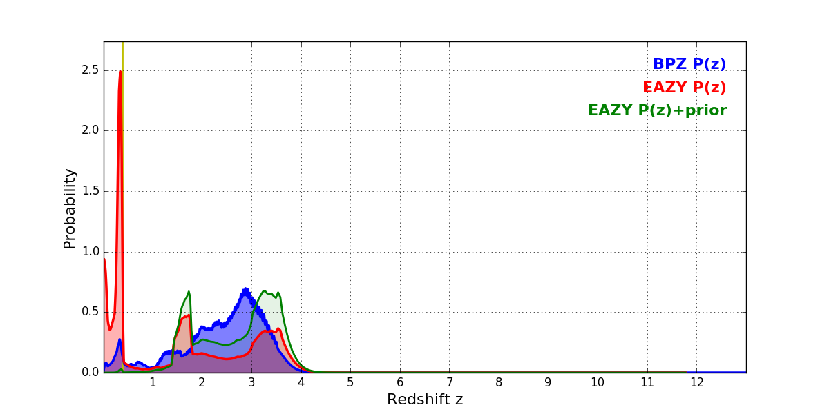 In P(z) plots: Yellow lines mark the cluster redshift z = 0.390,