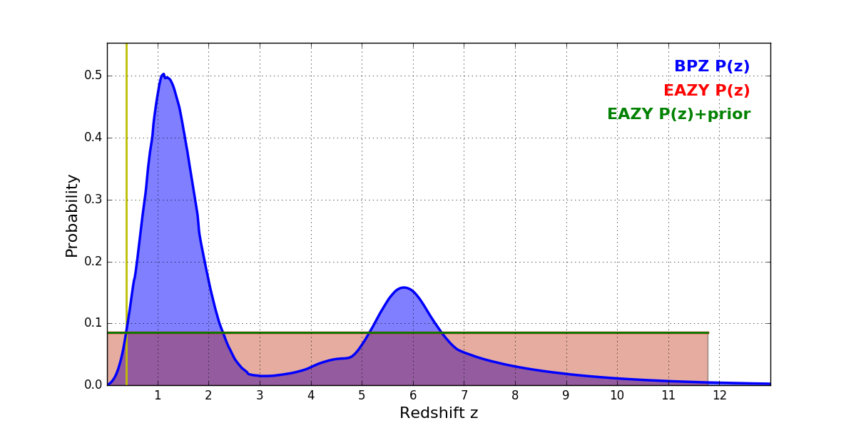 In P(z) plots: Yellow lines mark the cluster redshift z = 0.390,
